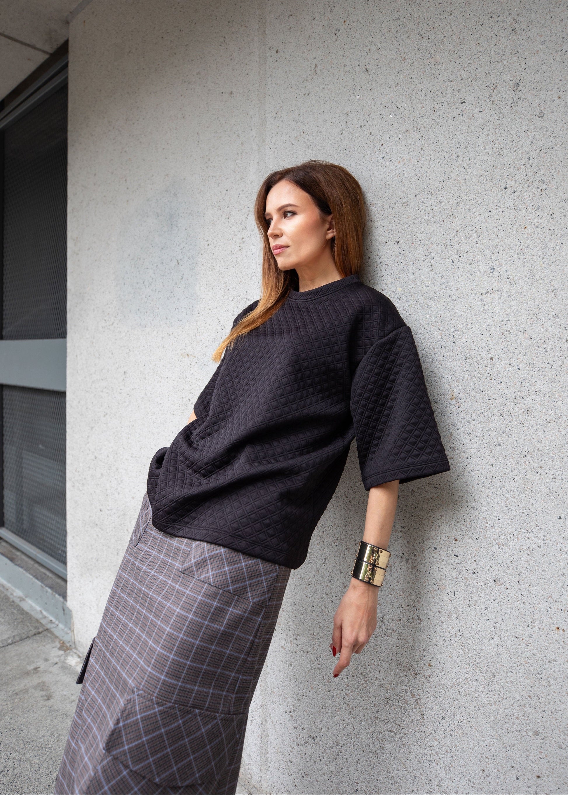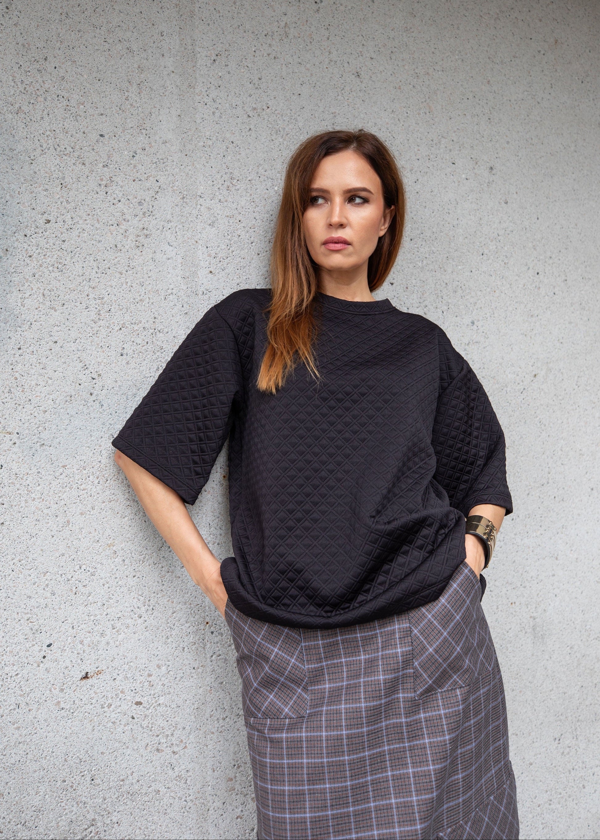 This top features a modern, boxy silhouette that creates a relaxed and effortless look.